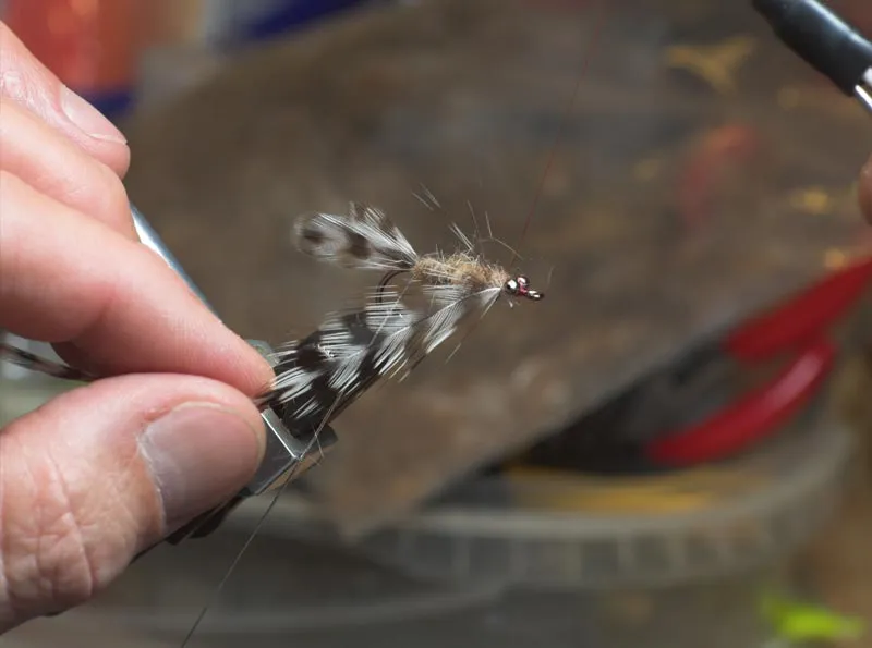 Tie in the hackle feather, butt first, shiny side forward just behind the eyes